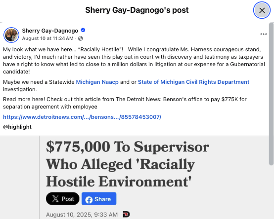 Even Democrats are speaking out, blasting the size of the settlement and the secrecy surrounding it as Benson campaigns on a promise of “efficiency and transparency”. Former Democrat State Representative Sherry Gay-Dagnogo took to social media, questioning the lack of transparency around the payout.