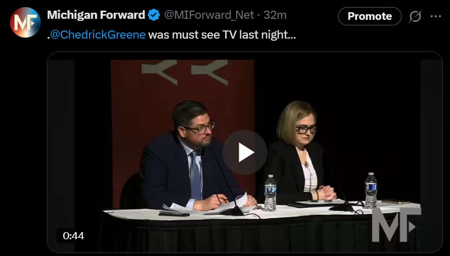 “It would be charitable to call Chedrick Greene’s performance in last night’s debate a trainwreck,” said Gabe Butzke, a spokesperson for Michigan Forward Network. “When he did actually answer questions, he used his time to defend violent criminals and advocate for raising taxes, something we’re sure the people of the 35th District won’t forget.”