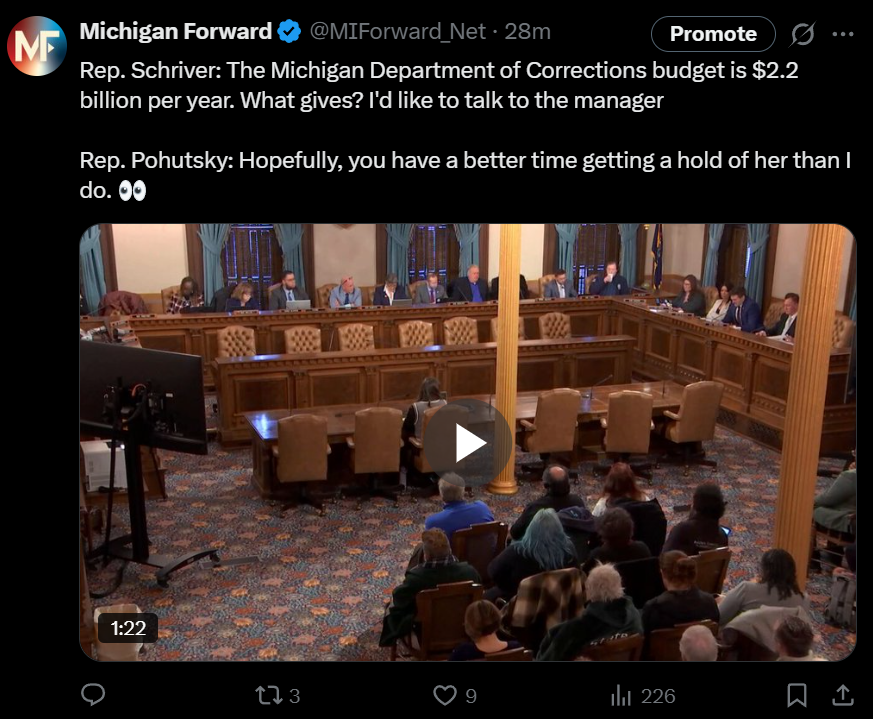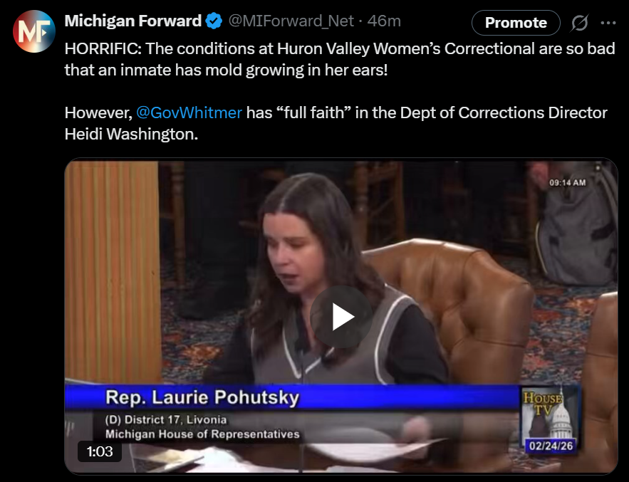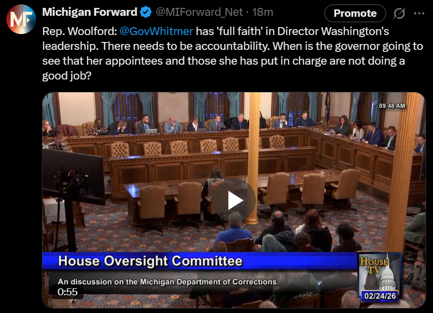 “This is not the first example we’ve seen of Gretchen Whitmer’s leadership team failing,” said Gabe Butzke, a spokesperson for Michigan Forward Network. “Time and again, the governor has put her faith in the wrong person, and real people are paying the price. From State Police leader Lt. Colonel James Grady, to MDHHS Director Elizabeth Hertel, and now the Director of the MDOC, Whitmer is standing idly by as her department heads wreak havoc on the people of Michigan.”