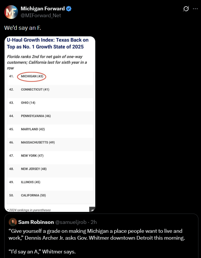 The data shows a predictable trend of people fleeing Democrat-run states for better-managed Republican states, like Florida and Texas. Michigan ended up 43rd overall, as people fled states like California, Oregon, Illinois, and New York even faster. This massive population loss under Governor Gretchen Whitmer is estimated to cause more than a $100 million drop in state revenue – money that could be used for schools, roads, or tax relief.